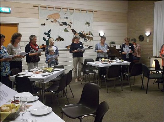 Het 2e gedeelte van de avond was er een afsluiting met een Agapèviering of Liefdemaaltijd genoemd. Zo kunnen mensen uit Oost en West elkaar vinden door te zingen, luisteren naar muziek en een gedicht, samen in gesprek over de zin van het leven en genieten van vis, brood en druiven en zo genoeglijk bij elkaar zijn en zich één voelen met elkaar.