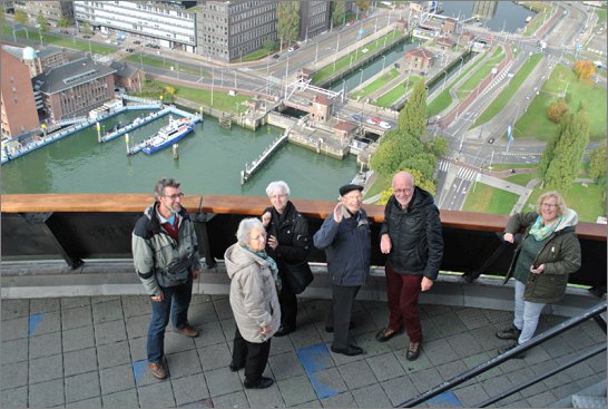 Zaterdag was de uitgaansdag naar Rotterdam. Voordat we met 22 mensen, verdeeld over 5 auto’s, vertrokken, vertelde Gerrit Elings als inleiding op deze excursie ons het een en ander over deze grootste havenstad van Europa.